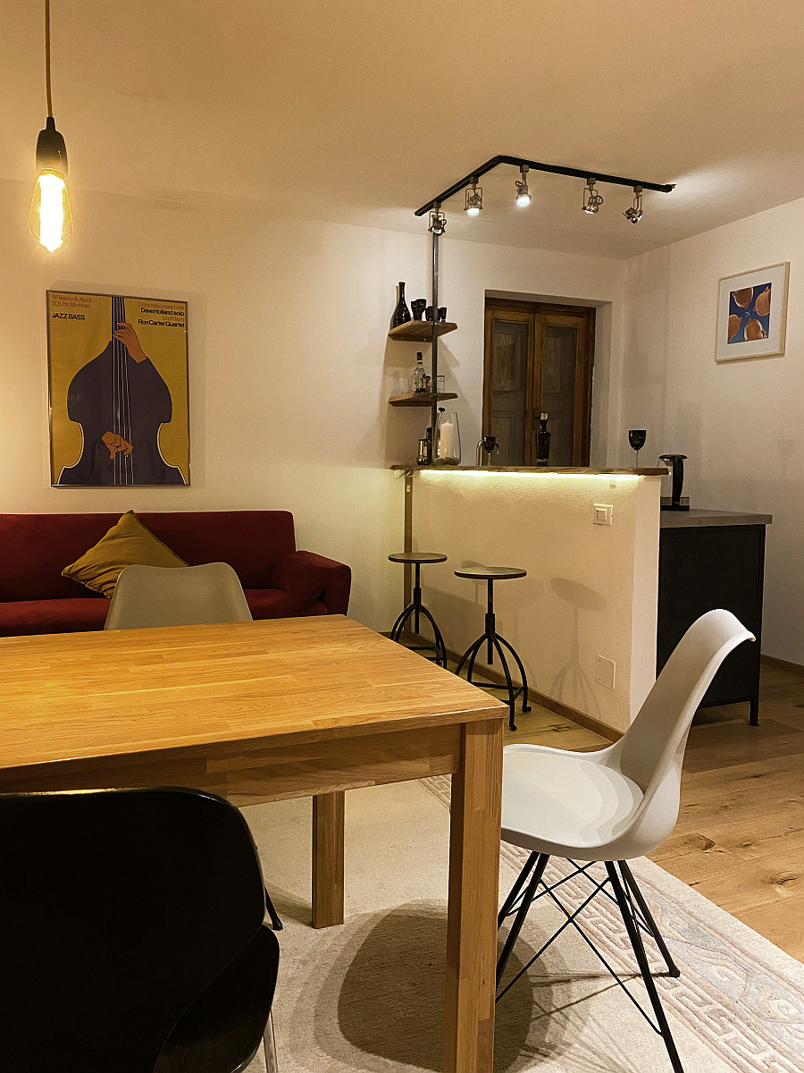 Die Ferienwohnung Meduna befindet sich im ersten Stock der Villa Rosa Friuli und bietet euch alles, was ihr für einen entspannten Aufenthalt braucht. Über eine Außentreppe und den großen Balkon erreicht ihr das 57 m2 große Apartment. Der vordere nach Süden ausgerichtete Wohn‑, Ess- und Kochbereich ist lichtdurchflutet und offen gestaltet. Der Balkon steht euch gemeinsam mit den Gästen von Apartment Arzino zur Verfügung. Ihr findet dort Ess- und Sitzmöglichkeiten und habt eine einmalige Aussicht. Im hinteren Bereich der Ferienwohnung befinden sich zwei Schlafzimmer — eines mit Doppel – und eins mit Einzelbett — sowie das Bad mit Dusche und WC.